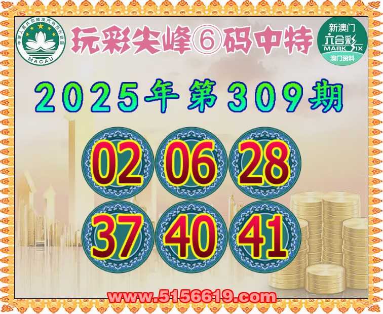 309期:【玩彩尖峰】 🥓⑥码中特🥓【02.06.28.37.40.41】开:06