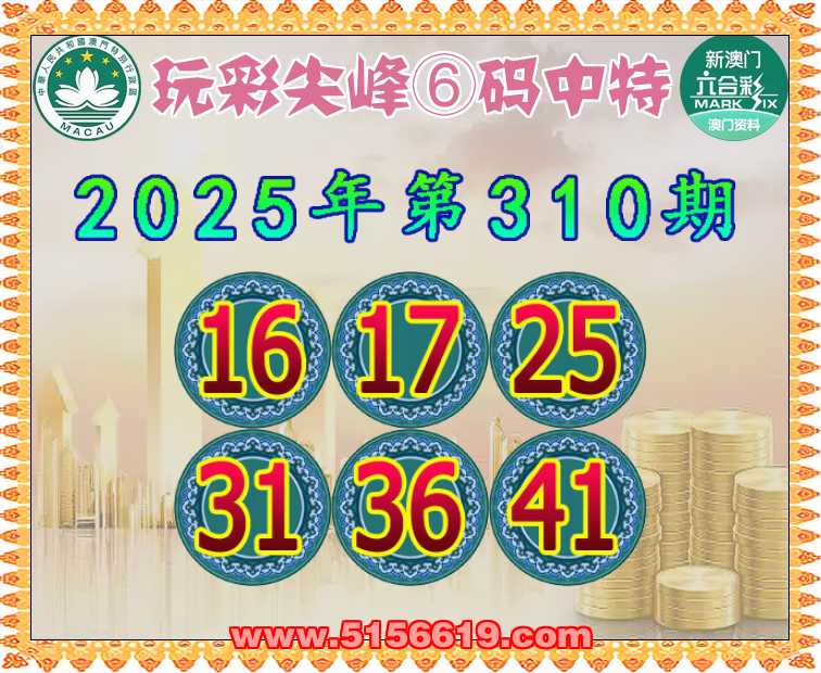 310期:【玩彩尖峰】 🥓⑥码中特🥓【16.17.25.31.36.41】开:16